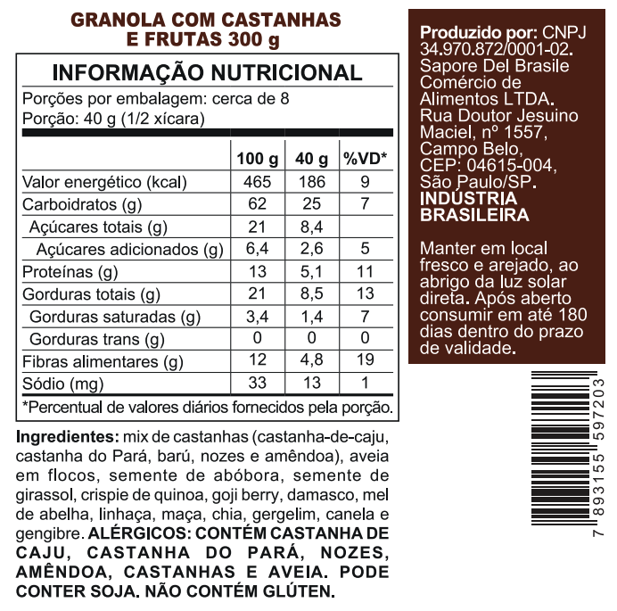 Uma combinação equilibrada de castanhas (caju, Pará, baru, nozes e amêndoas), sementes (abóbora, girassol, chia, linhaça e gergelim), frutas desidratadas (goji berry, damasco e maçã) e cereais (aveia e crispies de quinoa).