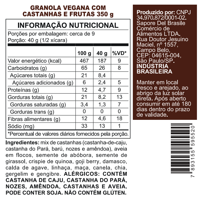 Uma combinação harmoniosa de castanhas (caju, Pará, baru, nozes e amêndoas), sementes (abóbora, girassol, chia, linhaça e gergelim), frutas desidratadas (goji berry, damasco e maçã) e cereais (aveia e crispies de quinoa).